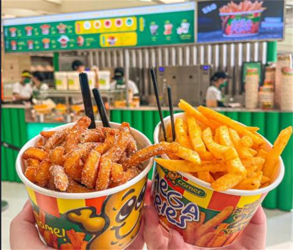 potatocorner薯条被誉为世界上味道最好的薯条,摇摆薯条来自菲律宾的人气薯条店Potato Corner于美国、澳洲、泰国、印尼、巴拿马等共开近一千多家分店。Potato Corner创立于1992年,是全菲律宾第一家风味薯条的专卖店。因为他们贩售的风味薯条非常受菲律宾人的欢迎,所以他们开始尝试在全球其它10个国家及地区,包括纽西兰、加拿大、阿联酋、泰国、柬埔寨、英国、中国、沙地阿拉伯、新加坡等多地开了门店,目前在全球各地门店数超1350+家。Potato Corner的薯条主打现点现炸现摇、不沾酱,吃的就是一个原汁原味。顾客可以将炸好的薯条放进桶里疯狂摇晃,直到让每一根薯条都裹上满满的调味粉。风味薯条一共有5种口味,芝士奶酪味、烧烤味、酸奶油&洋葱味、辣椒烧烤味,以及中国限定口味青瓜味。首次进驻国内于2022年,落座与广州动漫星城,而后又分别在深圳、佛山、成都、沈阳等地开出多家门店,从拓展态势来看,未来还将进一步扩张布局。Potato Corner薯条于1992年10月在菲律宾开设了第一家分店,并于次年开始特许经营。如今,它已经从小型手推车发展成几乎遍布世界每个角落的在线商店——商场、学校、医院、汽车站、游乐园,甚至多个国家的旅游目的地。在世界的每个角落,都有人想要Potato Corner。