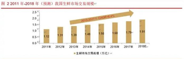 由于消费和饮食习惯,根据尼尔森对亚太零售的研究,亚洲消费者食品中生鲜的消费占比超过 50%。公开数据显示,2011 年我国生鲜市场的交易规模即达到 1.12 万亿元,2012 年-2017 年我国生鲜消费市场增速稳定在 6%以上,年复合增速 6.4%。