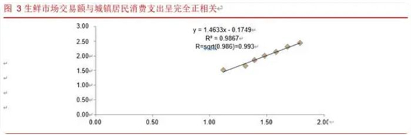 生鲜消费在居民消费中属于高频消费,我们结合上文公开资料显示的 2011-2017 年生鲜市场交易规模,与城镇居民消费支出构建回归模型,通过计算,y=1.463x- 0.174,相关指数R2为 0.986,其相关系数为 0.993,几乎接近完全正相关系数 1,以上数据说明我国生鲜的消费水平在过去几年中基本上伴随着居民消费的增加而发展。