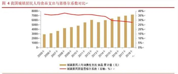 随着消费的不断升级,以及对更健康生活的追求,生鲜类消费也处于持续增长的态势。通过我国城镇居民人均食品消费支出与城镇居民恩格尔系数的对比,我国城镇居民人均食品消费支出近十几年仍保持较高的增速,自 2005 年至 2018 年的复合增速在 7%以上,而我国城镇的居民的恩格尔系数却处于持续下降的通道,由此也可以从侧面反映出生鲜类消费持续增长的趋势,并且我们认为未来随着我国消费者消费习惯的变化,生鲜市场的增速将快于居民消费的增速,我们看好生鲜行业在国内未来的发展。