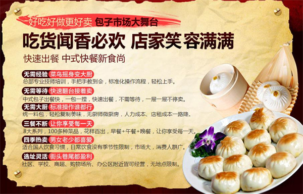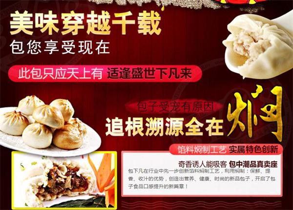 包下凡最火爆的招商项目,包下凡项目研发团队依靠强大的创新研发能力,在行业中先一步创新馅料焖制工艺,利用焖制:保鲜、提香、收汁的优势,创造出营养、健康、时尚的新品包子,开启了包子食品口感提升的新篇章!创新型发酵制剂配方,和好面后无需等待发酵。不用早起发面,省去其他同类产品2-3小时的发面过程。比别人高得多的产品加工效率,让您获得超乎想像的超高经济收益。市面难觅的虫草,配以多种鲜香酱料,组成独具一格的秘制养生馅。深受广大群众的喜爱。